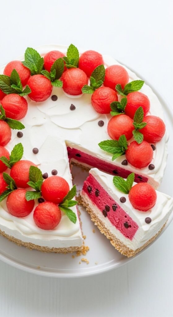 Press a coconut shortbread crust into the springform base, fill with softened watermelon sorbet, and fold in mini chocolate chips to mimic watermelon seeds before freezing — the result is a cake that looks and tastes exactly like summer. Top with whipped cream and arrange fresh watermelon balls cut with a melon baller in a circle across the surface. Add fresh mint leaves between the watermelon balls. This is one of the most visually playful ice cream cake ideas on this list and an absolute hit with children. Watermelon sorbet is available at most grocery stores, or make it at home by blending seedless watermelon and freezing in a pan.