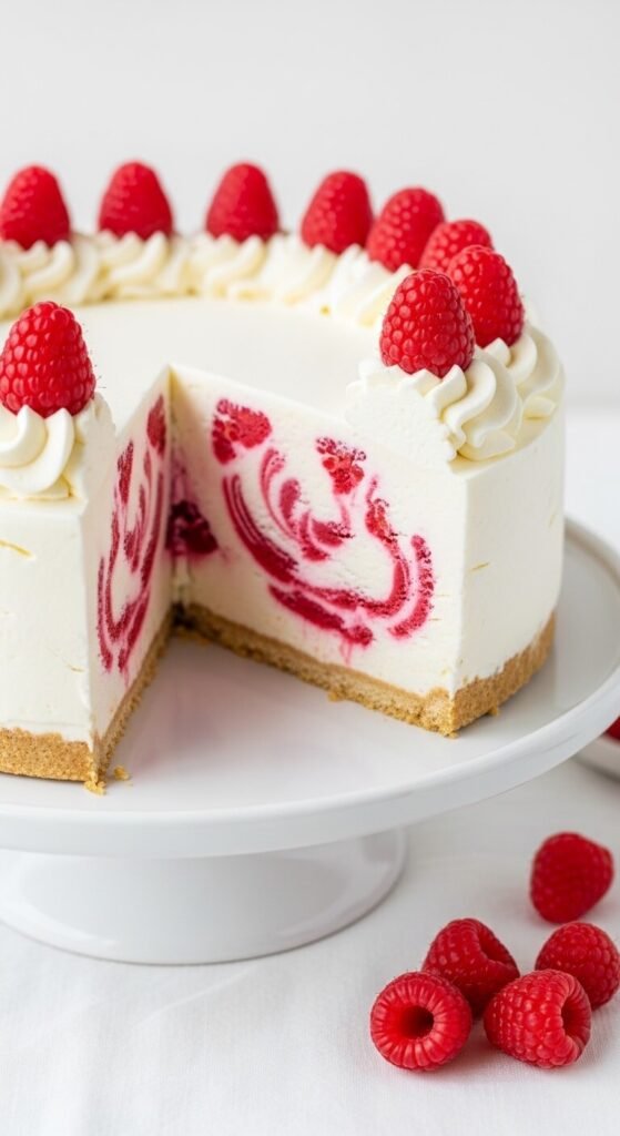 The raspberry ripple swirl inside the vanilla ice cream layer is what makes this cake exceptional. Soften vanilla bean ice cream and fold in spoonfuls of raspberry jam or fresh raspberry puree in loose, incomplete folds — you want visible ribbons of raspberry running through the white ice cream, not a uniform pink. Pour into the springform over a vanilla wafer crust and freeze solid. The swirl pattern becomes visible when the cake is sliced. Top with whipped cream rosettes and fresh raspberries. The visual payoff of the ripple cross-section is completely disproportionate to the effort involved in creating it.