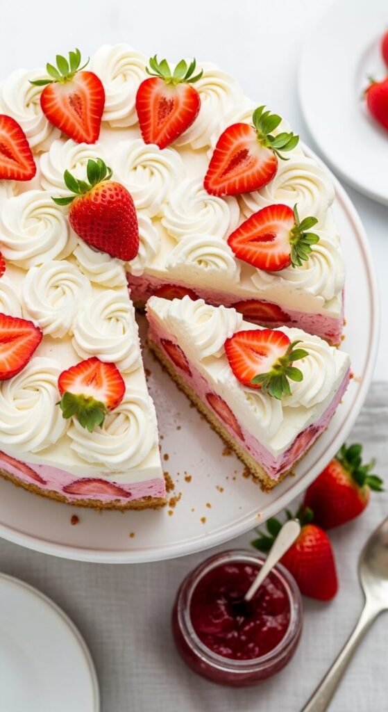 Crushed golden shortbread cookies mixed with melted butter create a crust that tastes like actual shortcake — buttery, crumbly, and sweet without being overpowering. Press into the pan base, freeze briefly, then spread softened strawberry ice cream on top. For a more dramatic interior, swirl a few spoonfuls of strawberry jam through the ice cream before freezing. Top with whipped cream piped in rosettes and fresh halved strawberries arranged decoratively. These ingredients are inexpensive in summer when strawberries are at their best. Make it the night before and unmold 10 minutes before serving for the cleanest slices.