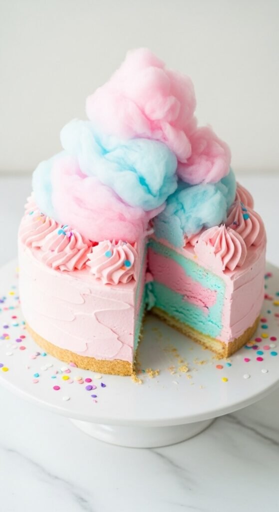 Cotton candy flavoured ice cream softened and poured over a vanilla wafer crust, frozen solid, frosted in pale pink or blue whipped cream, and crowned with a dramatic pile of store-bought cotton candy placed just before serving creates one of the most visually theatrical ice cream cakes available. Add the cotton candy immediately before serving — it begins to deflate and melt against the cold surface within an hour. The flavour combination is sweet, playful, and completely loved by younger birthday guests. Budget tip: cotton candy from bulk bins or dollar stores is identical to the premium versions sold in specialty grocery stores.