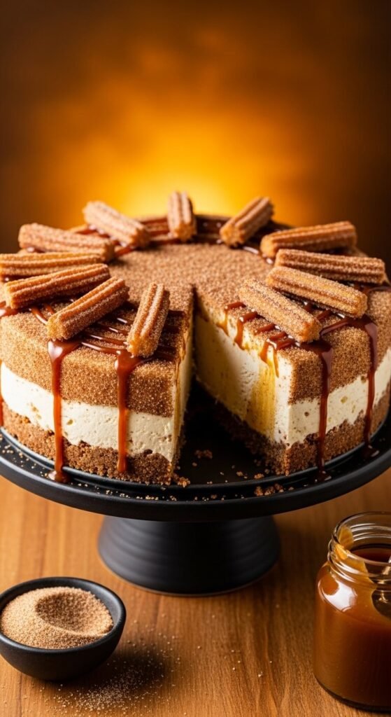 Crushed cinnamon graham crackers mixed with butter and a generous teaspoon of cinnamon create a base that tastes exactly like a churro. Fill with softened cinnamon ice cream or vanilla ice cream with cinnamon and brown sugar swirled through. Freeze overnight. Sprinkle cinnamon sugar generously across the whipped cream top and arrange small store-bought churro pieces (or cinnamon sticks) decoratively on the surface. Drizzle caramel sauce across everything just before serving. This cake is a natural fit for Mexican-themed birthday parties and is beloved by anyone who grew up eating churros at theme parks.