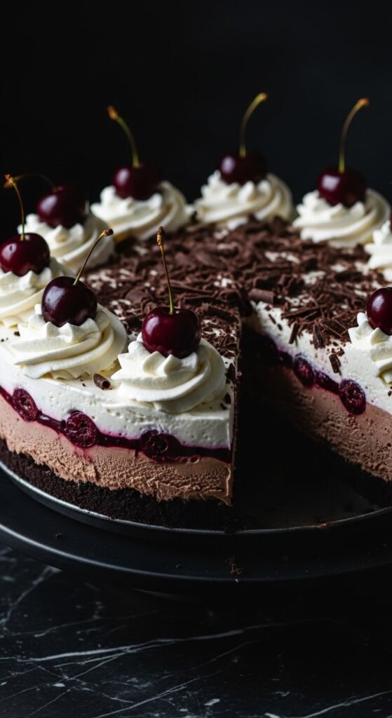 A dark chocolate Oreo crust, a thick chocolate ice cream layer, a cherry compote layer pressed on top, and a final layer of whipped cream piped in rosettes with dark cherries placed in each creates a Black Forest ice cream cake that looks genuinely spectacular. Make the cherry compote from frozen dark cherries, sugar, and a splash of vanilla simmered for eight minutes and cooled completely. Freeze the compote layer between the ice cream and the whipped cream for defined layers in each slice. Scatter dark chocolate shavings across the whipped cream surface. The combination of tart cherry, dark chocolate, and cream is a flavour profile that works at any age.
