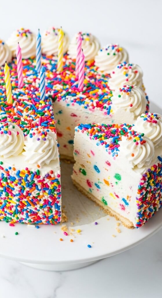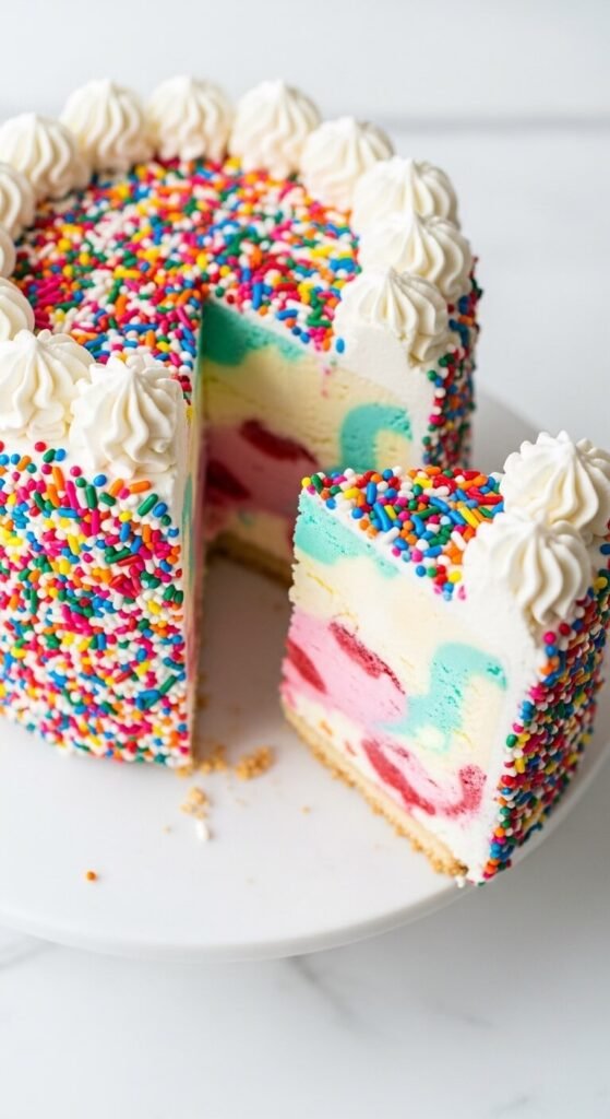 Funfetti ice cream — available at most major grocery stores — already has rainbow sprinkles distributed throughout, which means the confetti effect inside every slice requires zero extra effort. Press a vanilla wafer or sugar cone crust into the springform base, fill with softened funfetti ice cream, freeze overnight, and frost the exterior in white whipped cream. Press rainbow jimmie sprinkles across every surface. The funfetti interior combined with the sprinkle exterior creates a cake that is pure visual joy. Budget tip: making your own funfetti ice cream by folding sprinkles into softened vanilla ice cream costs considerably less than the premium branded version.