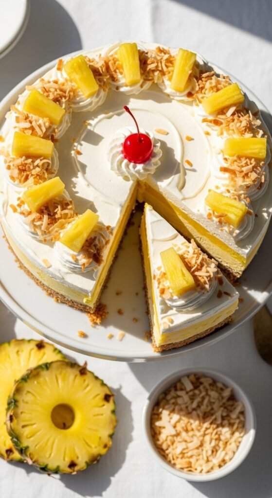 A coconut biscuit crust, softened pineapple coconut ice cream or mango sorbet mixed with coconut cream, and a toasted coconut whipped cream top with fresh pineapple chunks arranged in a ring creates an adults-only tropical birthday cake that is ideal for pool parties and outdoor summer celebrations. Add two tablespoons of coconut rum stirred into the softened ice cream before freezing for an adults-only version that still sets firm and slices cleanly. Toast the coconut topping in a dry pan for three minutes until golden — it adds a caramelised warmth that raw coconut doesn’t provide and finishes the cake with a professional-looking garnish.