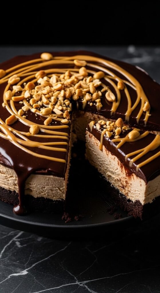 A dark chocolate Oreo crust, peanut butter ice cream, a poured dark chocolate ganache top, and chopped roasted peanuts — this is the ice cream cake for adults who take peanut butter and chocolate seriously. Press the crust firmly into the pan base and freeze until solid before adding the ice cream layer. Pour the ganache (heavy cream and dark chocolate melted together) over the frozen ice cream surface and return to the freezer until the ganache sets firm. Scatter peanuts immediately before serving. Drizzle extra peanut butter in thin ribbons across the ganache top for a presentation that looks professionally finished.