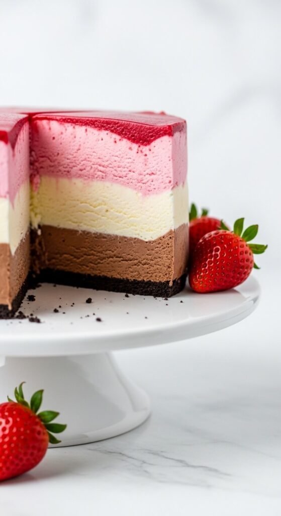 Three distinct ice cream layers — chocolate, vanilla, and strawberry — stacked above a dark chocolate cookie crust creates a Neapolitan cake that looks like a professional bakery made it. The key is freezing each layer completely solid before adding the next — rushing this step causes the layers to merge and you lose the clean, distinct stripes. Each layer needs at least two hours in the freezer. Use approximately one and a half cups of softened ice cream per layer for a cake with equal, well-proportioned stripes. Top with whipped cream and fresh strawberries. The cross-section slice is the moment everyone reaches for their phone.