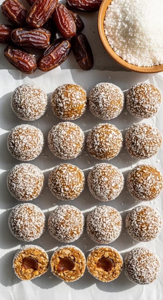 Medjool dates and desiccated coconut processed together create an energy ball that is naturally sweet, satisfyingly chewy, and holds together without any added binder because the date sugar is sticky enough on its own.
