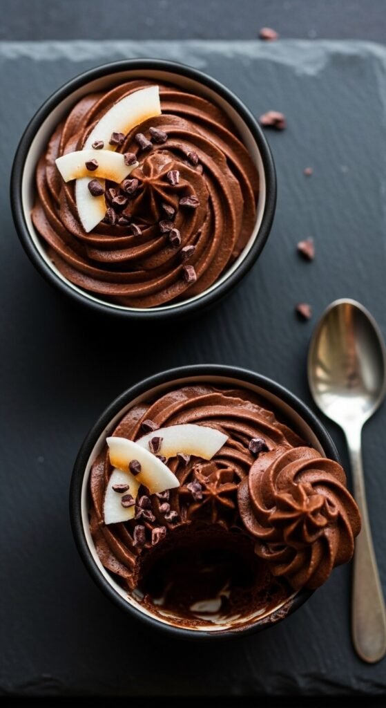 Refrigerate two cans of full-fat coconut cream overnight. Scoop out the solid cream and whip until fluffy peaks form. Melt 100g of dark chocolate and cool slightly. Fold into the whipped coconut cream gently.