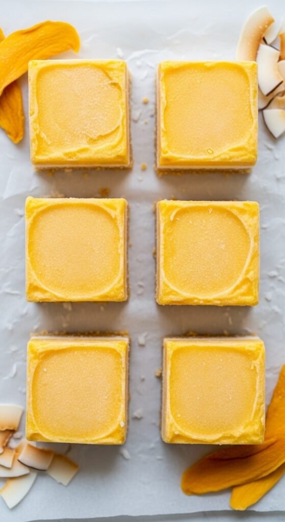 A coconut base layer topped with blended mango coconut cream and frozen into squares is a two-bite tropical dessert that cuts cleanly, stores for weeks, and costs almost nothing to make in batch.