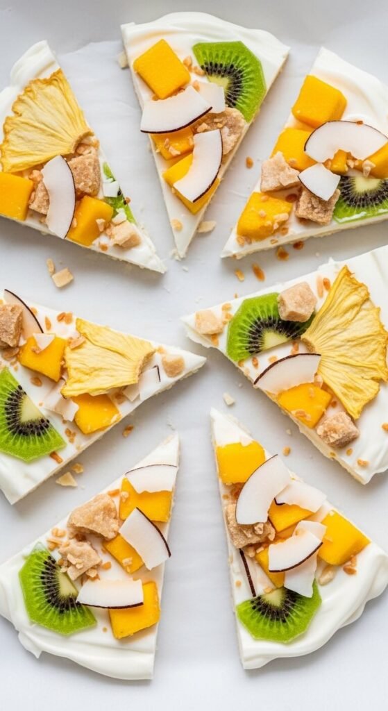 Coconut yogurt spread thick on parchment, topped with tropical fruit pieces, and frozen into bark creates one of the easiest no-bake coconut desserts — ready in under ten minutes of prep with a three-hour freeze.