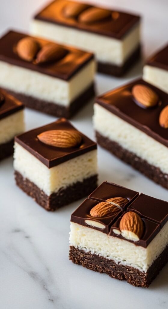 Three layers — dark chocolate, coconut filling, dark chocolate — create a homemade Almond Joy bar that tastes better than the store-bought version and costs about the same per piece.