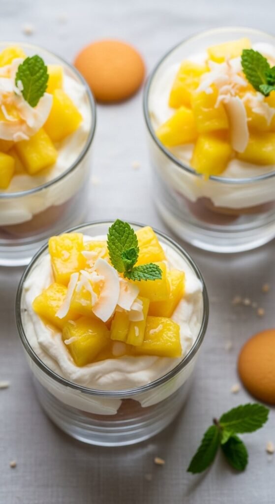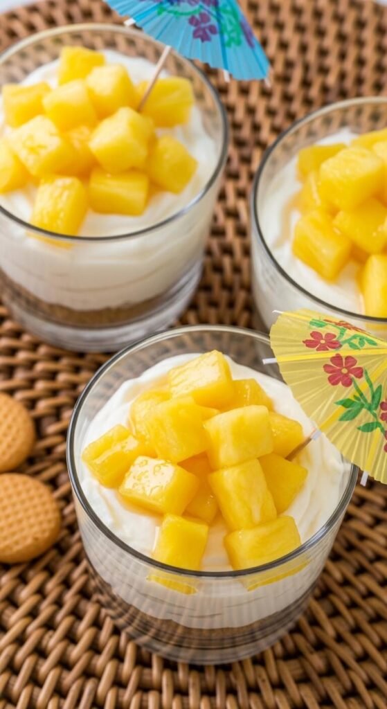 Whipped coconut cream layered with fresh pineapple and a vanilla wafer base creates a tropical dessert cup that is dairy-free, simple to assemble, and summer-appropriate for any gathering.