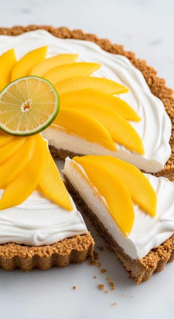A coconut-almond crust filled with a coconut cream lime filling and topped with sliced mango creates a tart that genuinely looks like it came from a tropical patisserie.