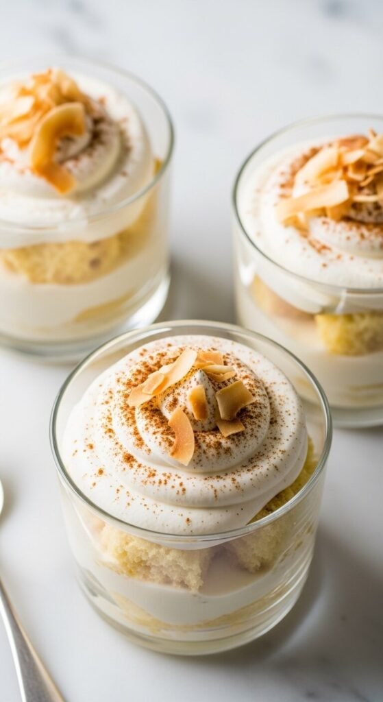 Store-bought sponge cake soaked in a three-milk mixture that includes coconut cream, topped with coconut whipped cream, creates an individual coconut tres leches cup that is impossibly moist and deeply tropical.