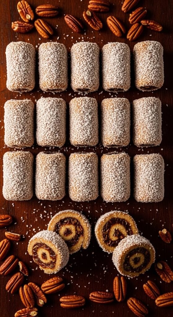 Medjool dates and pecans processed together and rolled in desiccated coconut create a naturally sweet, candy-like roll that requires zero cooking and holds its shape for two weeks in the fridge.