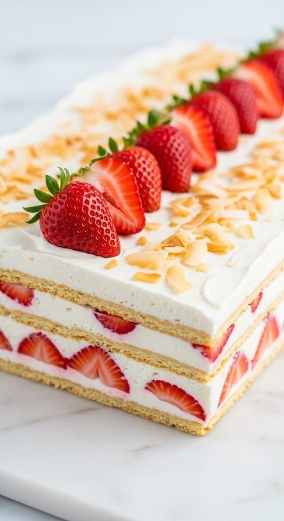 Layers of graham crackers, coconut whipped cream, and sliced strawberries create an icebox cake that softens overnight into a perfectly sliceable, coconut-infused layer cake without a single minute of oven time.