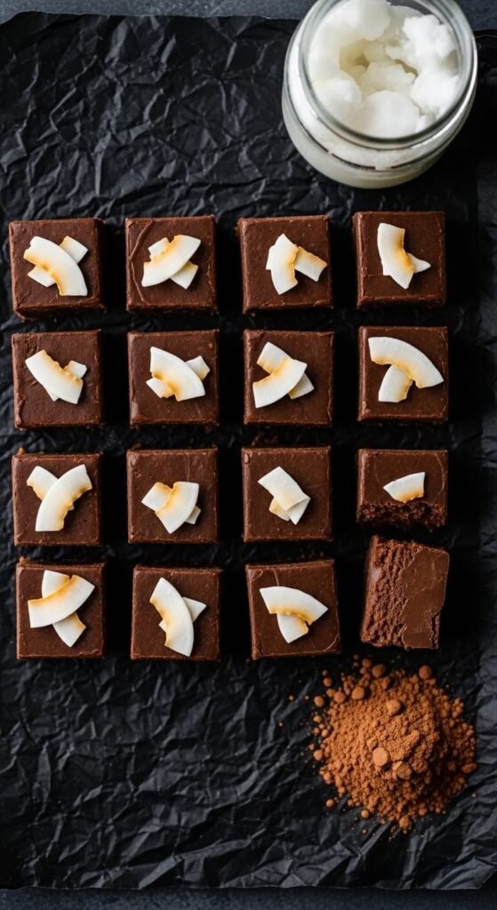 Coconut butter warmed and sweetened with maple syrup creates a naturally firm fudge that sets at room temperature without any cooking — just melting, mixing, and chilling.