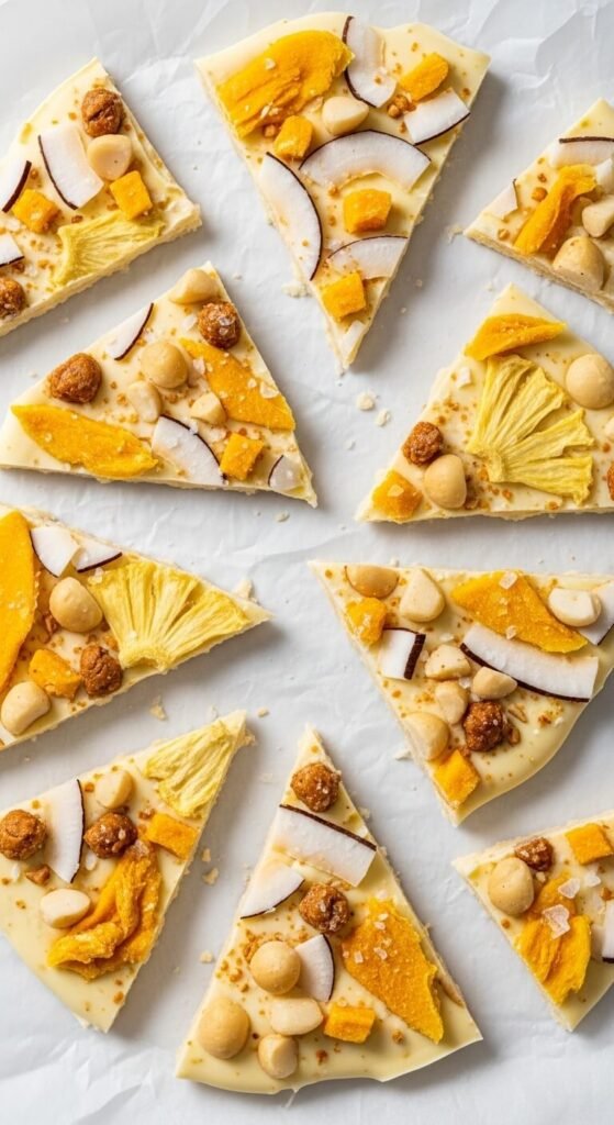Melt 200g of white chocolate with one teaspoon of coconut oil until smooth. Pour onto parchment and spread thin. Immediately scatter toppings: toasted coconut flakes, diced dried mango, dried pineapple, crushed macadamia nuts, and a pinch of flaky sea salt.