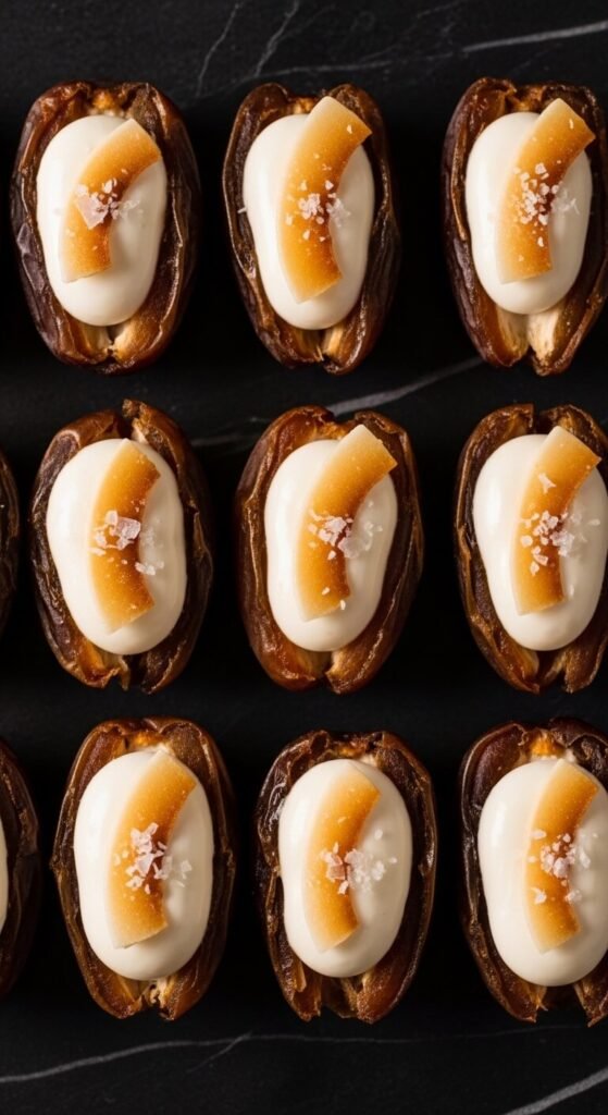 Large Medjool dates split and filled with sweetened coconut cream create a two-ingredient stuffed date that is naturally sweet, creamy, and served at room temperature as an elegant party bite.