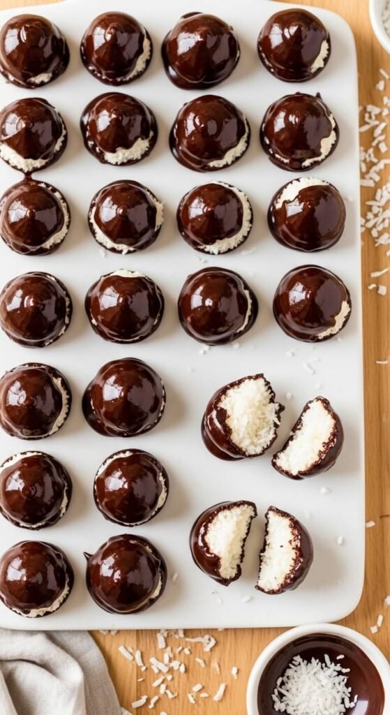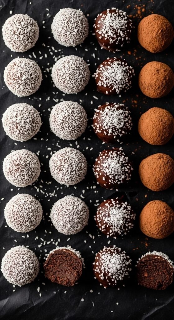 Dark chocolate ganache mixed with desiccated coconut and coconut cream creates a truffle that tastes like a Bounty bar elevated into a proper handmade candy — with none of the effort that implies.