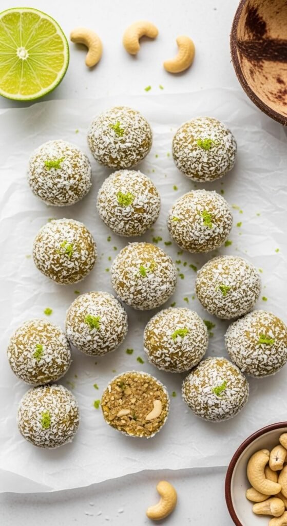 Cashews, desiccated coconut, lime zest, and lime juice create a bliss ball that is simultaneously rich from the nut fat, sweet from the coconut, and tart from the lime — a proper tropical flavor combination in a single bite.