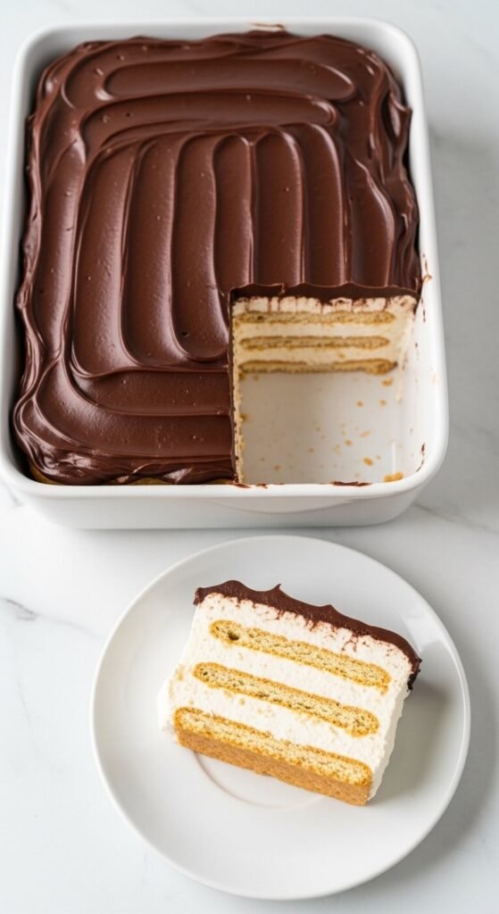 The original — three layers of graham crackers, vanilla pudding cream, and a chocolate glaze on top — is the recipe that launched a thousand variations. Whisk two boxes of instant vanilla pudding with cold milk, then fold in an 8-ounce tub of whipped topping until combined. Layer graham crackers across the base of a 9×13 dish, spread half the cream, add another graham cracker layer, spread the remaining cream, and finish with a final cracker layer. Spread chocolate frosting from a can — warmed slightly for easier spreading — over the top. Refrigerate overnight. The crackers become completely soft and cake-like by morning. Serves twelve for about $8 total.