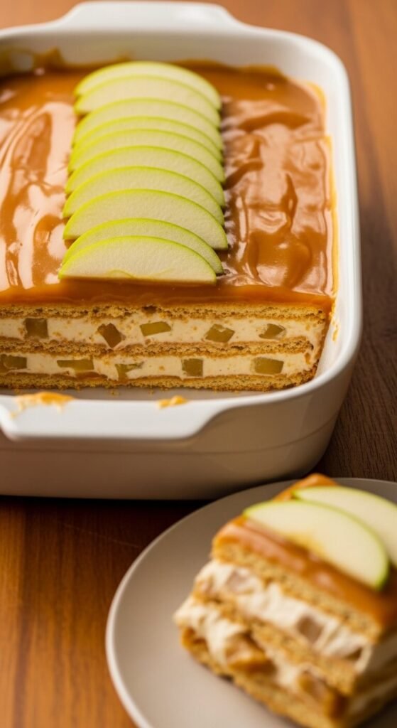 Caramel apple eclair cake brings two autumn flavors together in a layered dessert that is far more interesting than either alone. Fold caramel sauce and finely diced peeled apple into the vanilla pudding and whipped topping cream. The apple pieces soften as the cake rests overnight, becoming tender and flavorful throughout the filling layers. Top with a poured caramel glaze rather than chocolate frosting and press thin apple slices across the surface as a garnish. Store-bought caramel sauce costs $3. Two medium apples cost around $1. The full dish serves twelve for about $9. The caramel glaze soaks into the top cracker layer during chilling, making the surface almost transparent.