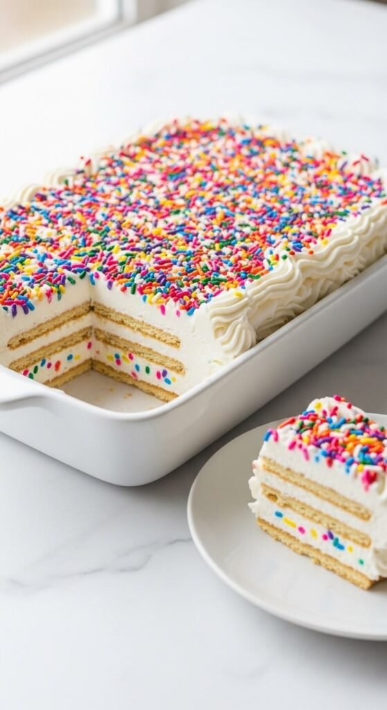 Birthday cake eclair cake is the layered dessert that makes the oven entirely optional for a birthday celebration — and the rainbow sprinkles make it look genuinely festive without any decoration skill. Add a teaspoon of almond extract and a generous handful of rainbow sprinkles to the vanilla pudding and whipped topping mixture for a classic funfetti birthday cake flavor. Layer over graham crackers. Spread white vanilla frosting on top and cover completely with rainbow sprinkles before refrigerating overnight. A can of white frosting costs $2. A jar of sprinkles costs $2 to $3. The full dish serves twelve for about $8 total. This is the birthday dessert that children request by name every year.