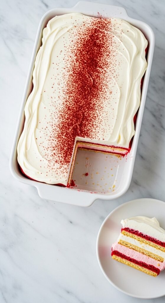 Red velvet eclair cake delivers the iconic cream cheese and deep cocoa flavor combination of the classic layer cake in a no-bake format that takes a fraction of the time. Add red food coloring and a tablespoon of cocoa powder to a cream cheese filling — cream cheese beaten with powdered sugar and vanilla, then folded with whipped topping — for the signature red velvet appearance and flavor. Layer over graham crackers. Top with cream cheese frosting spread smoothly across the final cracker layer and dust lightly with cocoa powder. A bottle of red food coloring costs around $2. Serves twelve for about $10 total. The color contrast of red cream and white frosting makes every slice look dramatic.