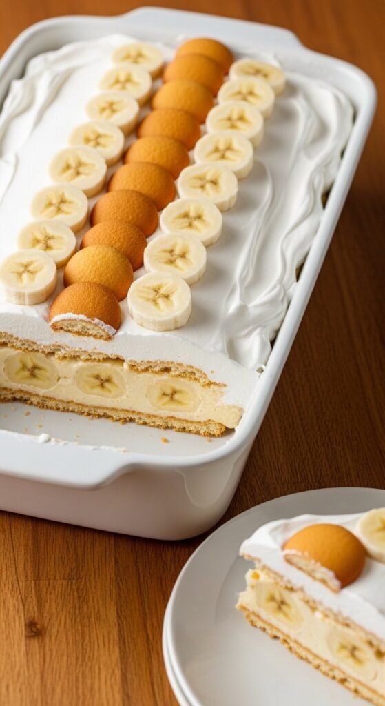 Banana pudding eclair cake replaces graham crackers with vanilla wafers and adds sliced banana rounds between every cream layer — creating a dessert that tastes like banana pudding and eclair cake at the same time. Use instant banana pudding mixed with cold milk and folded with whipped topping for the cream layer. Layer vanilla wafers instead of graham crackers. Tuck sliced banana rounds across each cream layer before adding the next wafer layer. Top with additional whipped topping and banana slices. Refrigerate for at least six hours — the wafers soften just like the graham crackers. A full dish serves twelve for about $9 total. Serve within 24 hours — bananas discolor after that.
