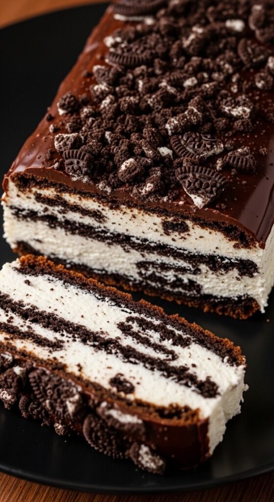 Cookies and cream eclair cake replaces the graham cracker layers with Oreo cookies — the contrast of dark cookie and white cream through the cross-section is visually dramatic and the flavor is pure Oreo cheesecake in layered cake form. Layer whole Oreo cookies in place of graham crackers across the base of the dish. Use instant vanilla pudding folded with whipped topping and a generous amount of crushed Oreo pieces mixed through. Top with a dark chocolate glaze and scatter additional crushed Oreos across the surface before refrigerating. A family pack of Oreos costs around $3. A full 9×13 dish serves twelve for about $9 total.