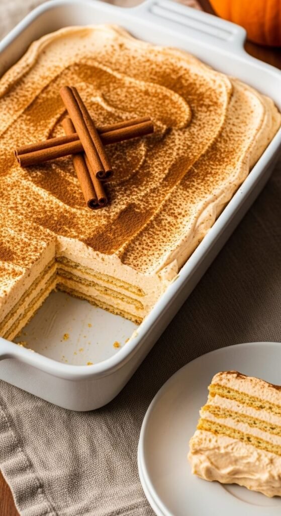 Pumpkin spice eclair cake is the autumn version of the classic — and it is the dessert that gets requested from September through Thanksgiving every single year. Mix canned pumpkin purée and pumpkin pie spice into two boxes of instant vanilla pudding before folding in the whipped topping. The pumpkin thickens the cream slightly and gives it a natural orange color. Layer over graham crackers and top with a simple cinnamon cream cheese glaze or a dusting of cinnamon and powdered sugar rather than chocolate frosting. Canned pumpkin costs $1.50. A full dish serves twelve for about $9 total. Make it two days ahead — the flavors improve significantly with time.
