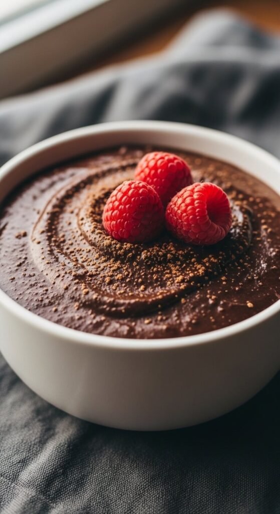 Blend 2 ripe avocados, 4 tablespoons of raw cacao powder, 3 tablespoons of maple syrup, and a splash of vanilla until completely silky smooth. Taste and adjust sweetness. Chill for 5 minutes or serve immediately. It tastes deeply chocolatey — the avocado disappears entirely in both flavor and texture. Budget tip: Buy overripe avocados marked down at the store — they’re perfect for blending and usually cost almost nothing. Raw cacao is more nutritious than regular cocoa but costs more — standard unsweetened cocoa powder is a perfectly good affordable substitute.