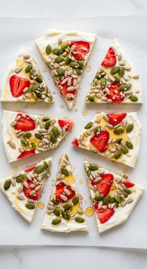 Spread 1 cup of plain Greek yogurt into a thin layer on parchment paper. Scatter mixed seeds — pumpkin, sunflower, hemp, or flax — across the surface along with berries or sliced banana. Drizzle with raw honey. Freeze for 20 minutes until firm. Break into pieces. Rich in protein, omega-3s, and healthy fats. Budget tip: Mixed seed blends from the baking aisle are affordable and nutritionally dense per serving. Frozen fruit costs far less than fresh and works just as well pressed into the yogurt before freezing. Store broken pieces in a zip-lock bag in the freezer for up to two weeks.