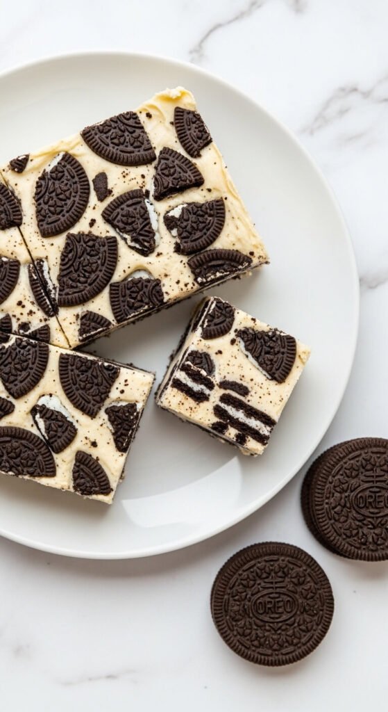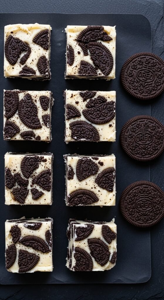 Cream cheese melted with white chocolate and powdered sugar produces a denser, tangier fudge base that carries crushed Oreo pieces far better than a standard condensed milk version. The cream cheese adds structure that keeps the cookie pieces evenly distributed rather than sinking. Fold in roughly crushed Oreos — filling and all — before pouring into the pan for flavour throughout the base. Press whole Oreo halves into the top surface before chilling. For cleaner slices, score the top surface lightly with a hot knife before the fudge fully sets to pre-mark your cutting lines. Refrigerate at least three hours.