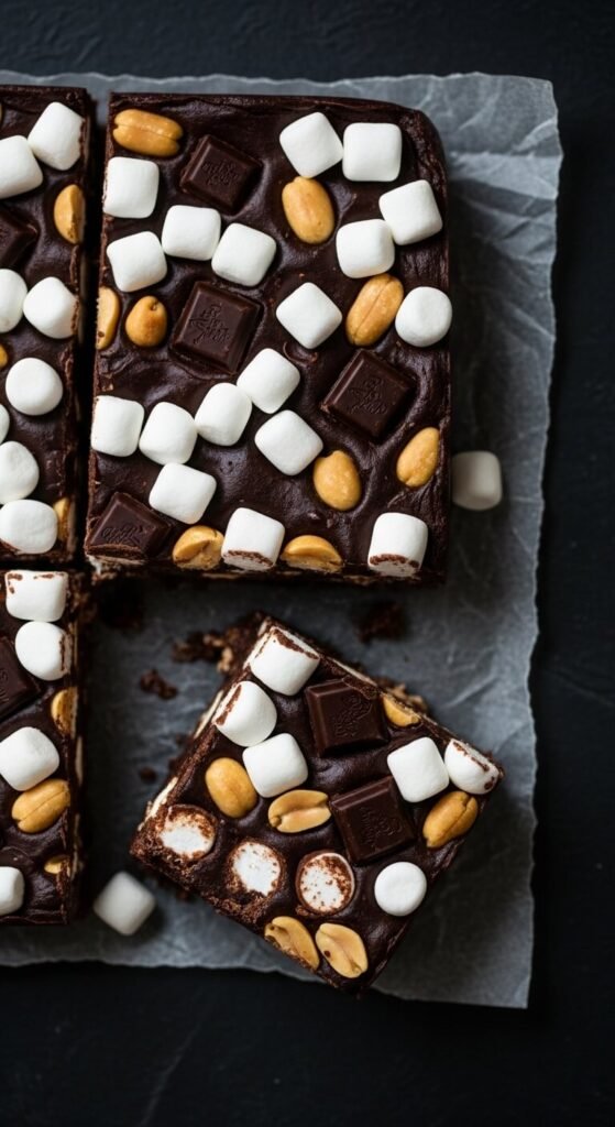Mini marshmallows, roasted peanuts, and rough-chopped dark chocolate folded into a dark chocolate-condensed milk fudge base create a rocky road version that looks genuinely spectacular on a dessert table. The key is working quickly — fold all the mix-ins into the warm fudge just before pouring into the pan, then immediately press extra marshmallows, peanuts, and chocolate pieces into the top surface before the fudge begins to set. The layering of textures — chewy marshmallow, crunchy peanut, snappy chocolate — against the dense fudge base is what makes rocky road such an enduring combination in any form.