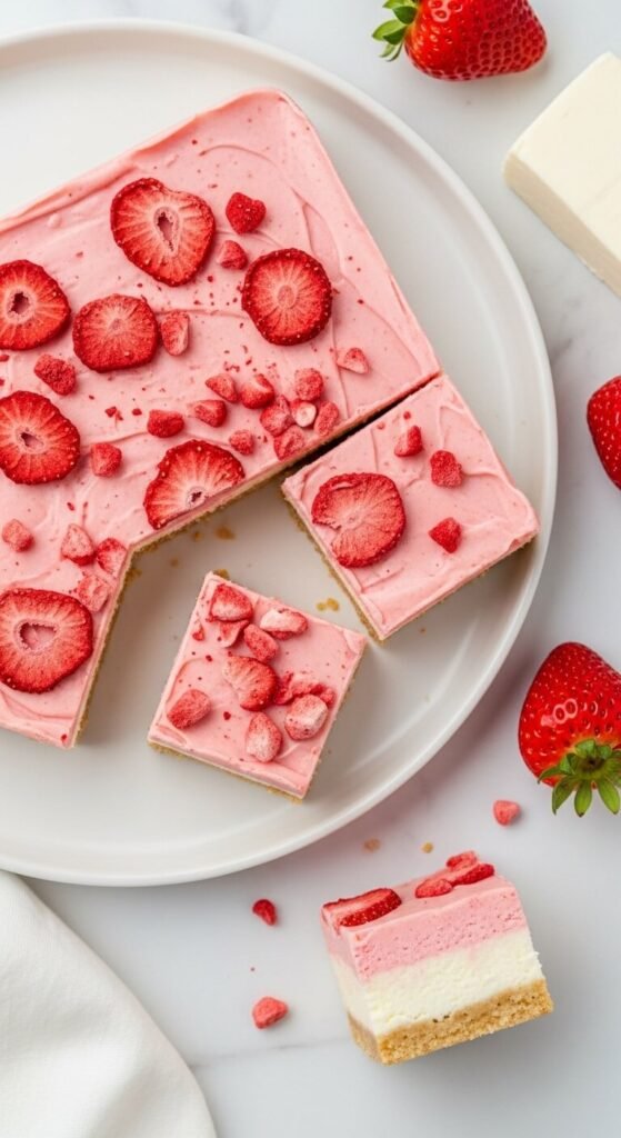 Cream cheese and white chocolate create a fudge with a tangy, cheesecake-like base that tastes far more sophisticated than the ingredient list suggests. Soften the cream cheese fully before mixing — cold cream cheese creates a lumpy, grainy texture that won’t smooth out. Beat in melted white chocolate, powdered sugar, vanilla, and a tablespoon of sour cream. Swirl in strawberry jam for a pink marbled pattern, or layer plain and strawberry versions for a striped effect. Scatter freeze-dried strawberry pieces on top before chilling. These look like something from a patisserie display and cost almost nothing to make.