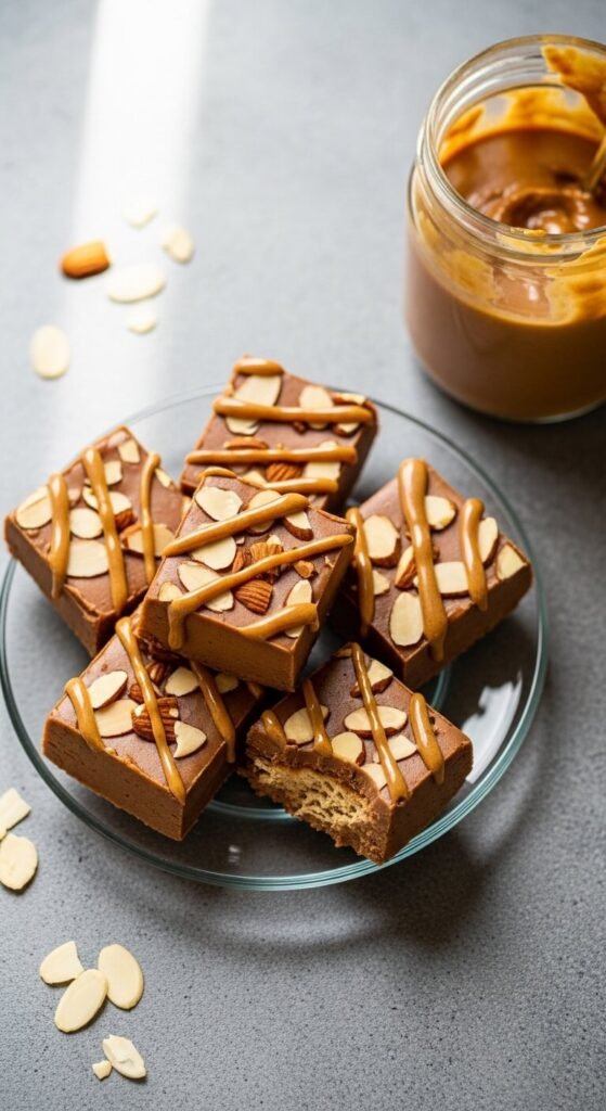 Almond butter produces a lighter, more delicate fudge than peanut butter — the flavour is subtler and lets the chocolate come through more clearly in every bite. Melt dark chocolate chips with sweetened condensed milk and a generous spoonful of creamy almond butter until completely smooth. Pour into the lined pan and immediately drizzle extra almond butter across the surface in thin ribbons. Drag a toothpick through the ribbons for a marbled pattern. Press sliced almonds across the top before chilling. These are a great school-safe alternative for households where peanuts are restricted — always check that your almond butter is processed in a nut-free facility.