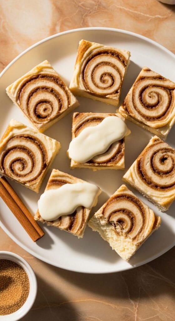 A cinnamon-brown sugar swirl dragged through a white chocolate-cream cheese fudge base creates squares that taste like the gooey center of a fresh cinnamon roll. Make the cinnamon paste first: softened butter, brown sugar, and cinnamon mixed to a smooth spreadable consistency. Pour the white chocolate fudge base into the pan, drop spoonfuls of cinnamon paste across the surface, and drag a knife through in loose spirals. Drizzle cream cheese frosting (powdered sugar, cream cheese, vanilla, and milk) across the chilled, set fudge just before serving. Serve at room temperature for the softest, most cinnamon roll-like texture.