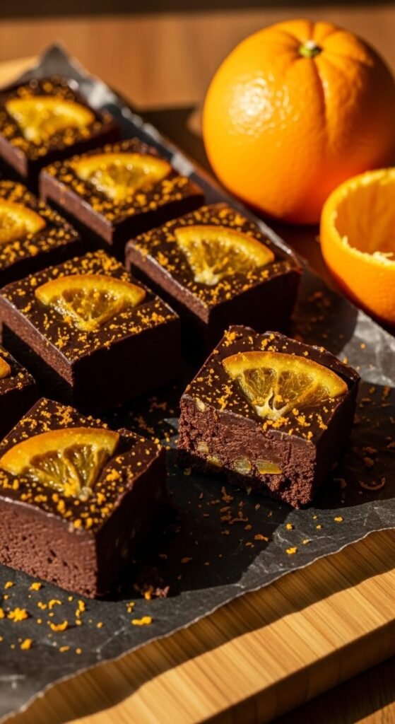 The zest of two oranges added directly to the melted chocolate-condensed milk mixture infuses the entire batch with a natural citrus fragrance that extract can’t replicate — the heat releases the essential oils in the zest and they distribute through the fudge completely. Use 70% dark chocolate for the strongest chocolate-orange contrast. Press candied orange peel pieces across the surface before chilling for a visual and flavour finish that looks expensive and takes about 30 seconds. A pinch of cinnamon in the base adds a subtle spice note that makes the orange flavour feel warmer and more complex.