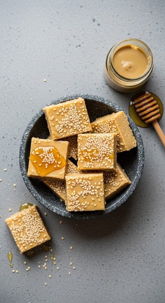 Tahini and honey melt together into a smooth, slightly savoury fudge base that tastes like halva in a creamier, more accessible form. No chocolate required. Warm tahini, honey, coconut oil, and a pinch of salt together until fluid, stir in powdered sugar until the mixture thickens, and pour into a lined pan. Scatter toasted sesame seeds generously across the top immediately. This fudge is naturally dairy-free and gluten-free when made with certified ingredients. It sets slightly softer than chocolate fudge — keep it cold. The flavour is nutty, subtly sweet, and genuinely unlike anything else on this list.