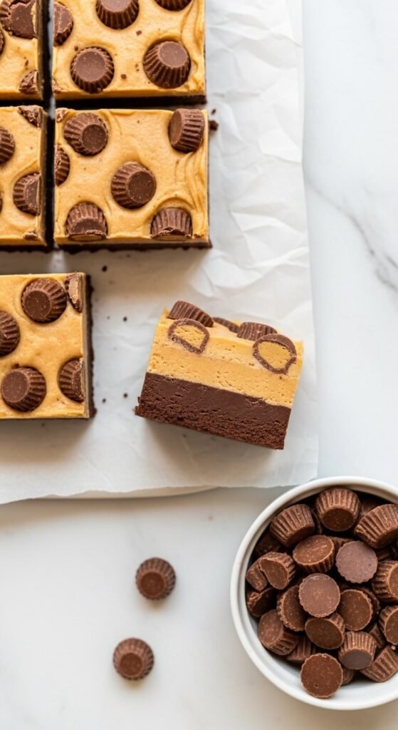 Two-layer fudge — dark chocolate on the bottom, peanut butter on top — with Reese’s Pieces pressed into the surface is the fudge version of the most beloved candy bar in existence. Make the dark chocolate fudge base and refrigerate until firm, about 45 minutes. Make the peanut butter fudge layer: peanut butter, butter, and powdered sugar warmed until smooth. Pour over the set chocolate layer while still slightly warm and spread evenly. Immediately press mini Reese’s Pieces and peanut butter cup halves into the surface. Refrigerate for two hours. Slice with a hot knife for the cleanest layer separation in each piece.