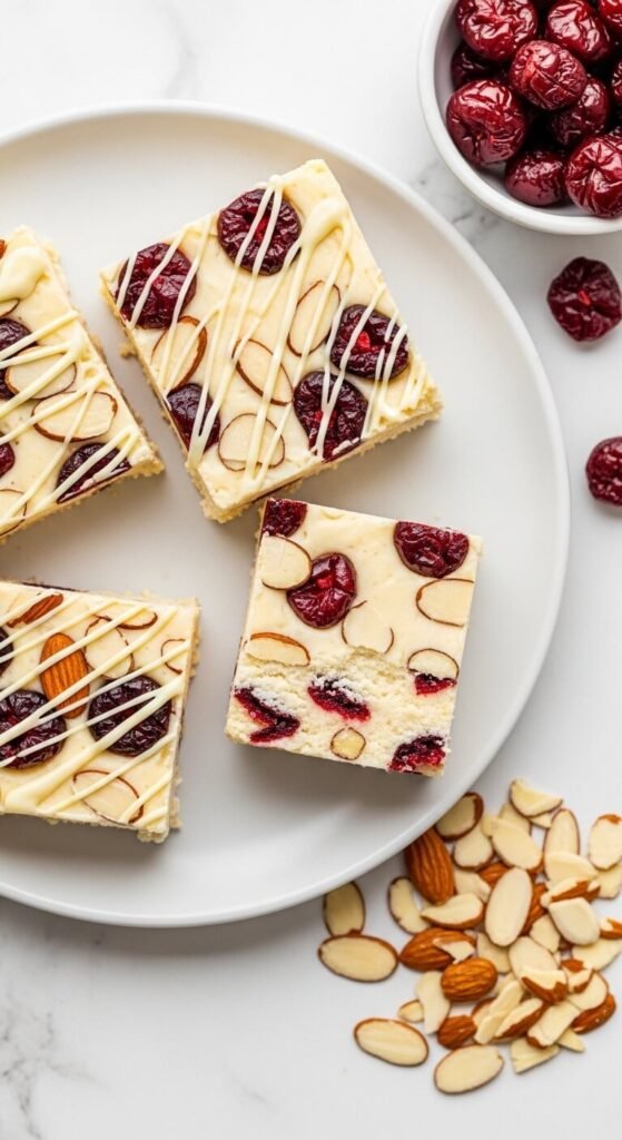 Dried tart cherries and sliced almonds folded into a white chocolate fudge base create a combination that tastes like a cherry bakewell in fudge form — almond-sweet, slightly tart, and richly textured. Add a quarter teaspoon of almond extract alongside the vanilla — it amplifies the almond flavour significantly without making the fudge taste artificial. Press extra cherry pieces and almond slices into the top surface before chilling. Drizzle melted white chocolate in thin ribbons over the set fudge just before serving. These are ideal for gift boxes and look beautiful on a holiday dessert platter.