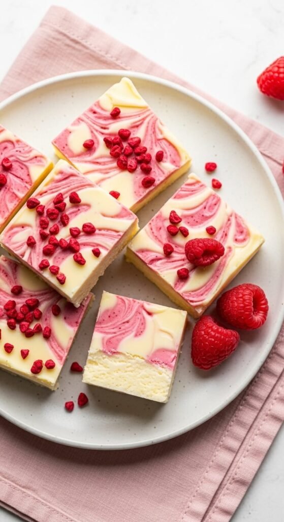 White chocolate and raspberry is one of the most elegant flavour combinations in confectionery — and it works beautifully in a no-bake fudge. Melt white chocolate chips with sweetened condensed milk and vanilla until smooth. Pour half into the lined pan, drop spoonfuls of raspberry jam across the surface, pour the remaining fudge over the top, and drag a knife through in slow figure-eight motions for a swirl effect. Scatter freeze-dried raspberry pieces on top before chilling. The tartness of the raspberry cuts through the sweetness of the white chocolate precisely. Slice small — this one is rich.
