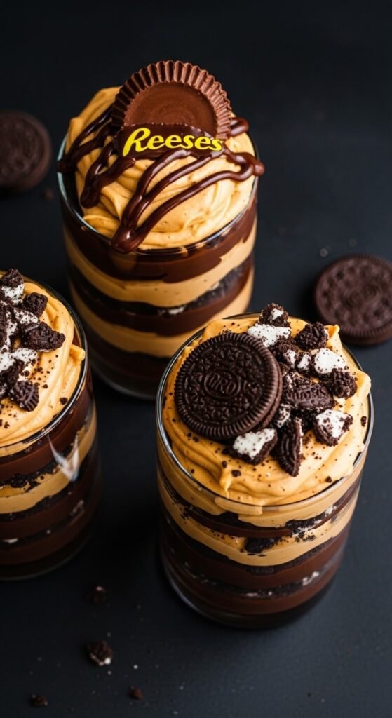 Alternating layers of chocolate pudding and peanut butter cream in a clear glass create a parfait cup that is visually dramatic and tastes exactly like eating a Reese’s cup in dessert form.