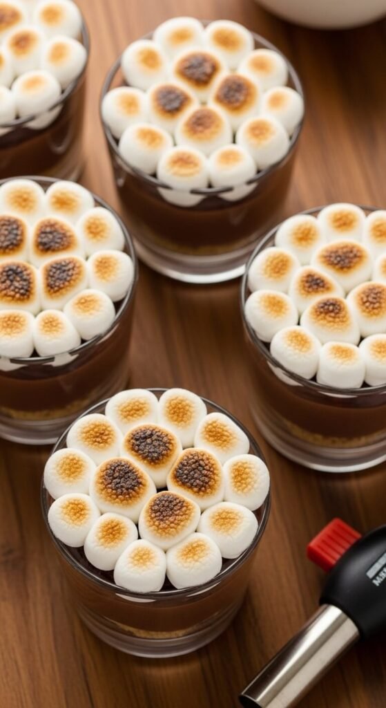 Use a kitchen torch to toast the marshmallow tops until golden and blistered in spots. Kitchen torches cost $12 to $20 at kitchen supply stores and are the single best investment for s’mores cup situations. Assemble the pudding layers up to a day ahead and torch just before serving.