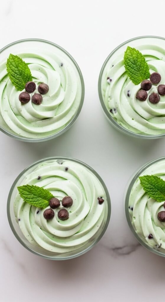 Peppermint extract folded into whipped cream with mini chocolate chips creates a mousse that tastes exactly like mint chocolate chip ice cream — but in a light, airy cup format.