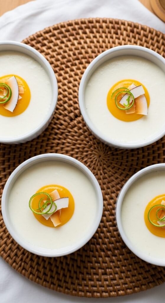 Pour into cups and refrigerate two hours until set. Top with blended fresh mango and a curl of lime zest. Canned coconut milk produces a richer set than the carton variety. Makes eight small cups per can.