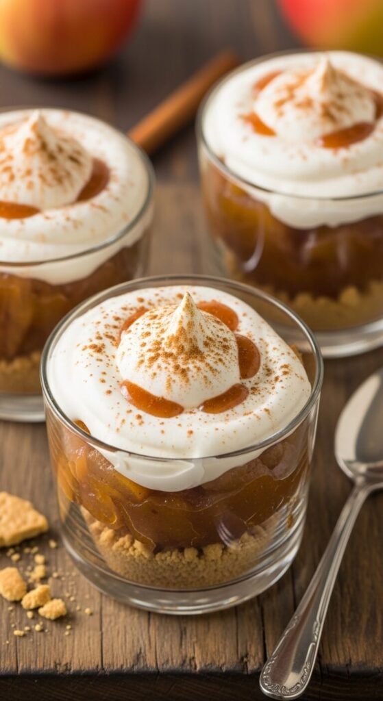 Cinnamon-spiced apple compote over a graham cracker base with whipped cream creates a no-bake apple pie cup that delivers the full autumn dessert experience without a single pastry skill required.