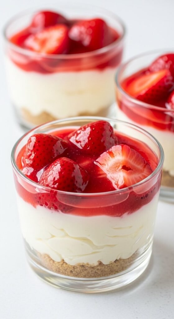 Layer crushed graham crackers mixed with melted butter in the bottom of each glass. Top with a filling of cream cheese beaten with powdered sugar, a squeeze of lemon, and vanilla. Add sliced strawberries on top.